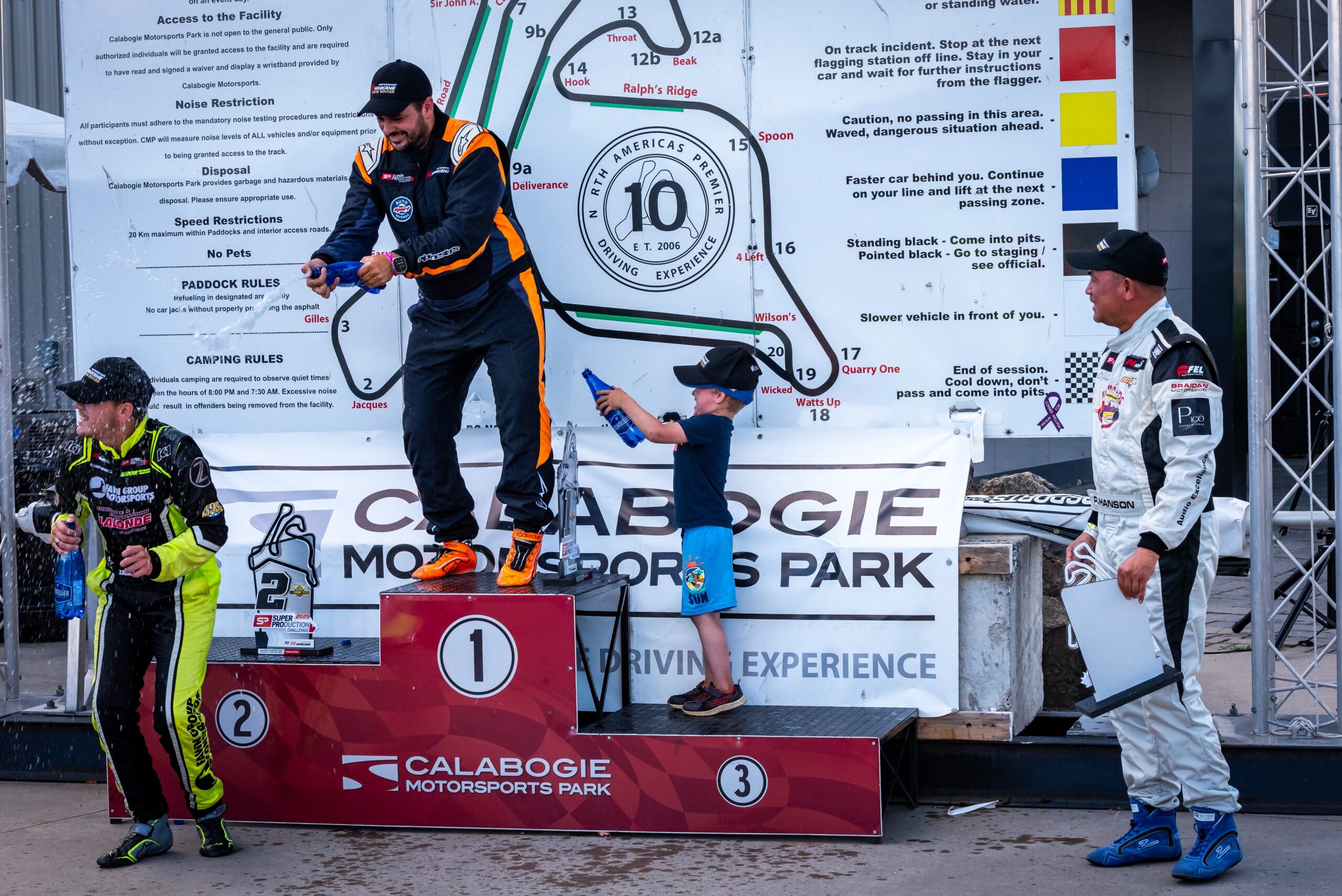 When we arrived at the podium for the trophy presentations, little Carter was there waiting for us, so I invited him onto the podium to hold the trophy. It’s tradition to spray the bubbly stuff, but in recent times the drivers have turned to spraying each other instead of spraying into the air. If you know me you know I don’t like getting sprayed, so I jump off the podium to stay dry. I gave the full bottle to little Carter and what happened next was one of the cutest and funniest post podium episodes. Carter had seen the other drivers spraying the bubbly stuff, so he stood there with his arms outstretched, bottle in hand, waiting for the spray to fly. He did not know he needed to shake the bottle. As he stood in anticipation of the opportunity to soak some people, he began giggling which made the rest of us in attendance giggle too. It eventually occurred to him that the bubbly wasn’t going to spray on its own, so he decided to pour the contents on the other drivers. Everyone shared in the laughter. It was a nice way to cap our weekend.